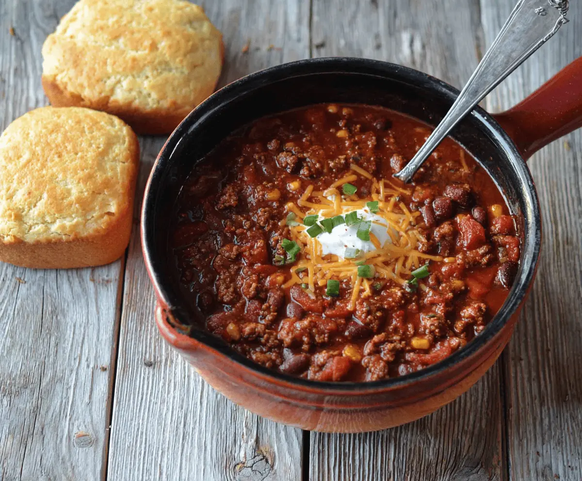 This chili pairs wonderfully with cornbread, crackers, or rice. You can also top it with shredded cheese, sour cream, or chopped green onions for added flavor and texture!