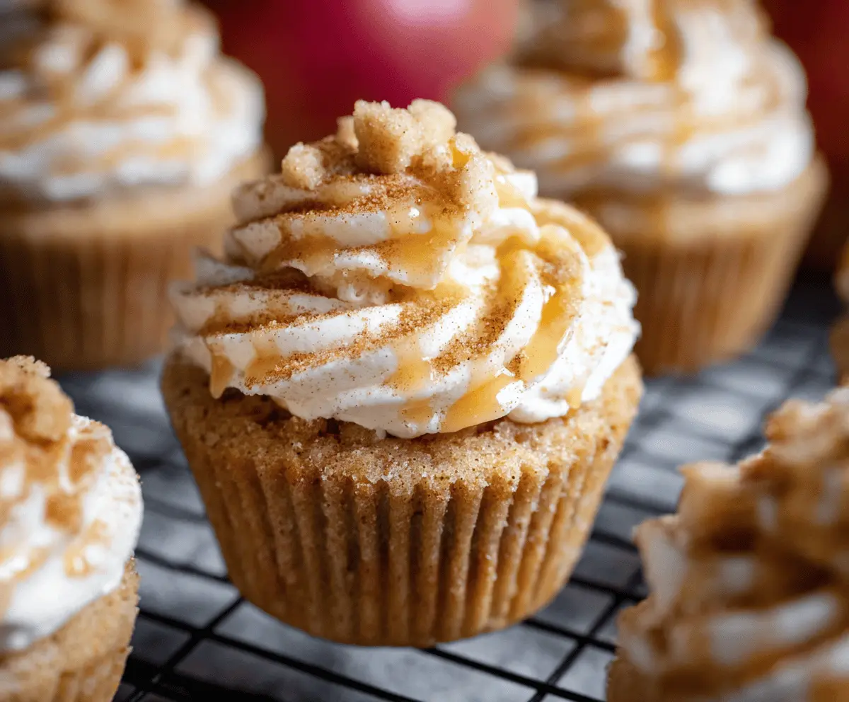 Drizzle caramel sauce over the frosting, sprinkle lightly with cinnamon, and top each cupcake with a small cube of fresh apple for that extra touch of sweetness and crunch.