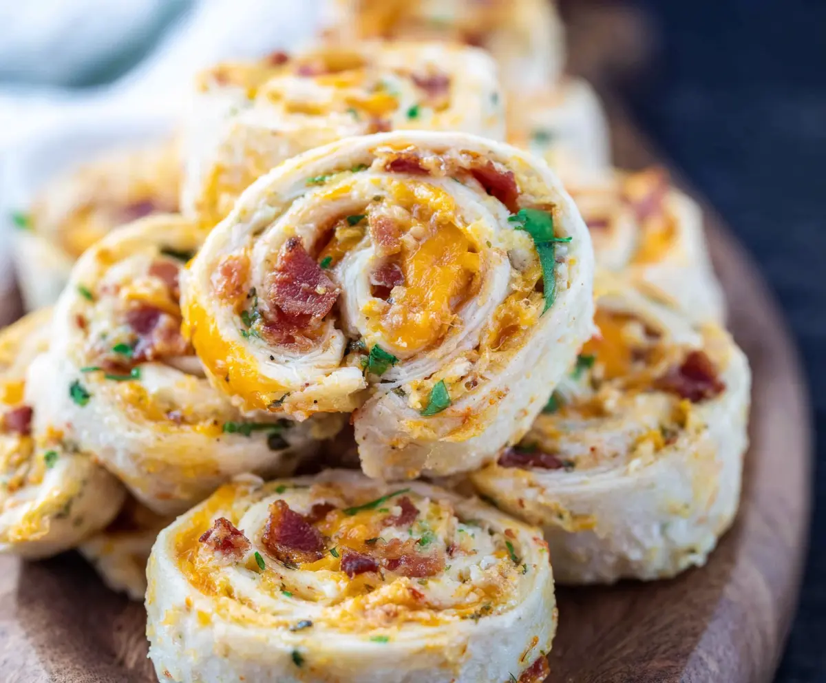 Delicious Bacon Cheddar Ranch Pinwheels on a platter, showcasing crispy bacon, melted cheddar, and fresh herbs.