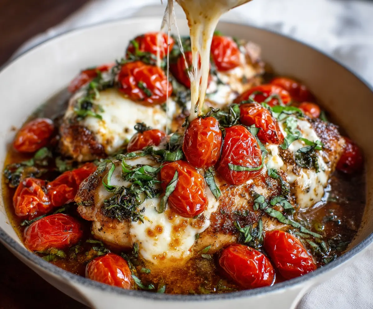 Your Baked Caprese Chicken is ready! Serve it hot with the roasted cherry tomatoes on the side and a garnish of basil. Enjoy this delightful, easy meal with your family or friends—it’s sure to be a hit!