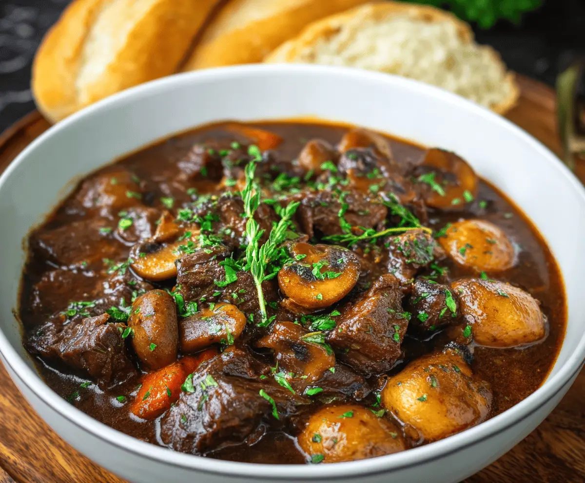 Garnish with fresh thyme or parsley, and serve hot. This stew pairs beautifully with crusty bread or over a bed of fluffy mashed potatoes for a comforting meal!