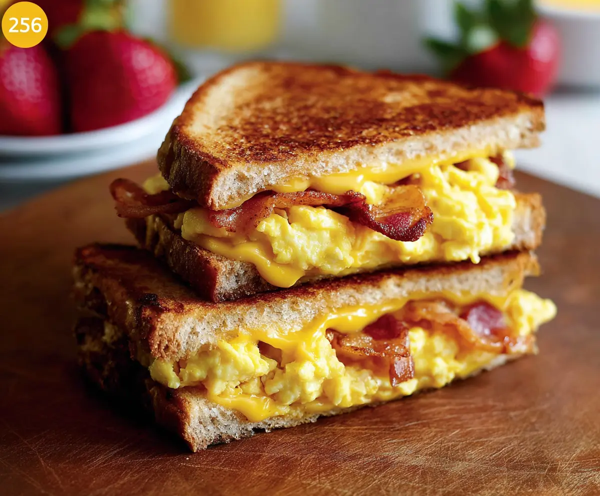 This breakfast grilled cheese is the ultimate morning treat! It’s packed with creamy scrambled eggs and crispy bacon, all melted between golden, toasted bread.
