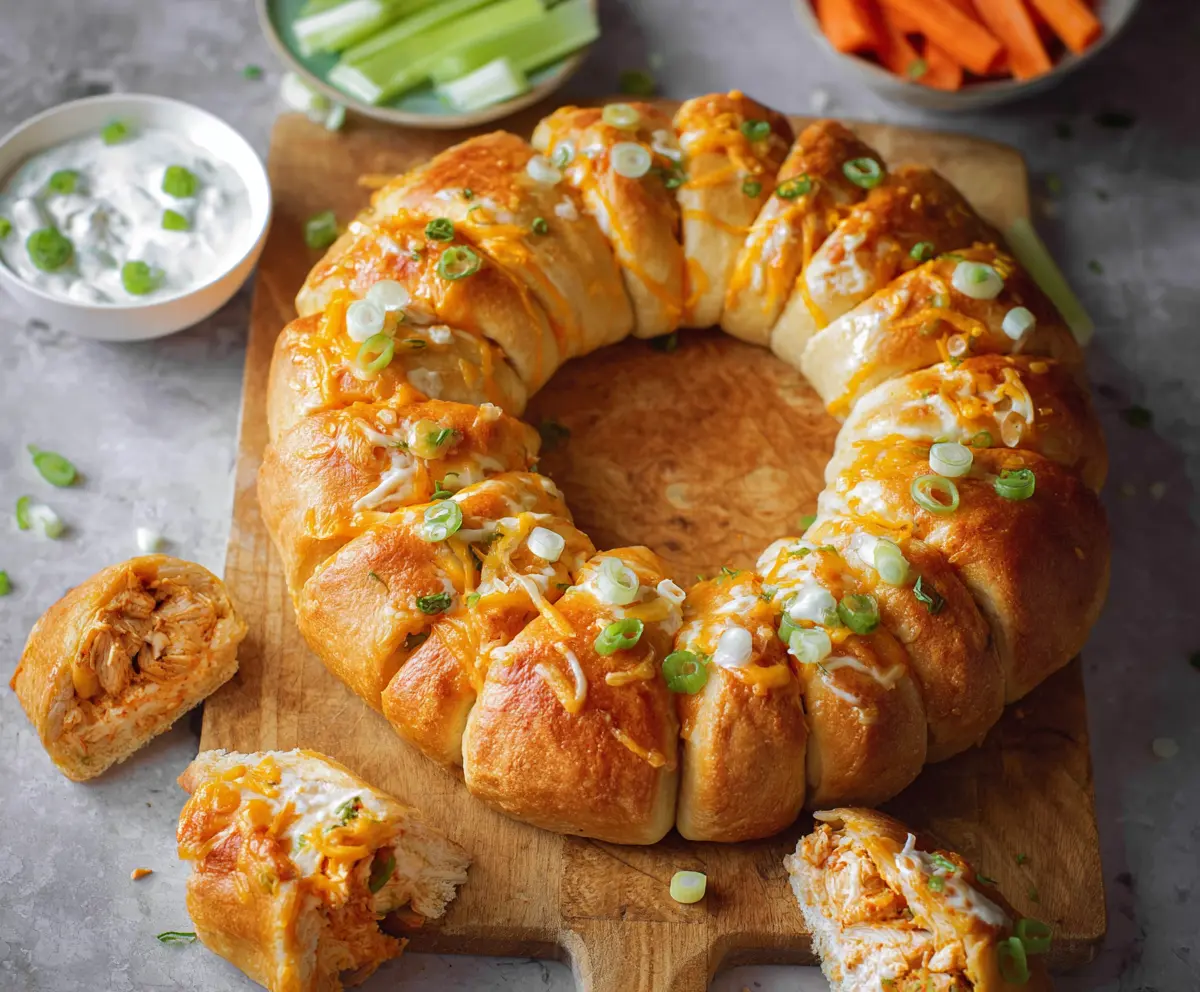 Serve your Buffalo Chicken Crescent Roll Ring warm, and don’t forget to provide additional ranch or blue cheese dressing on the side for dipping. Enjoy every cheesy, spicy, and delicious bite!