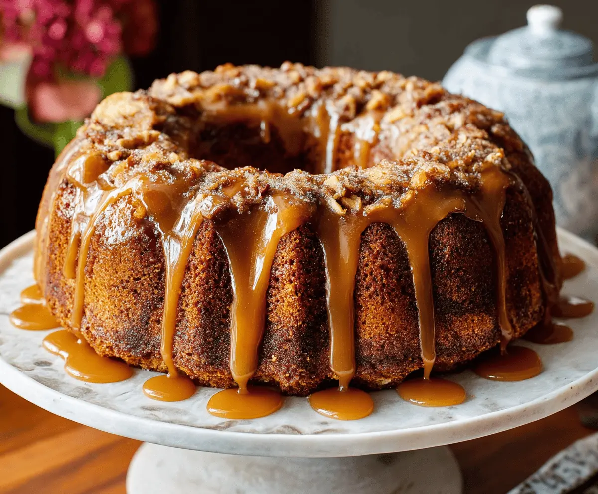 Place the cooled bundt cake on a serving plate. Pour the warm caramel sauce generously over the top, letting it drip down the sides. If you made the sautéed apples and chopped nuts, feel free to sprinkle them on top for garnish!