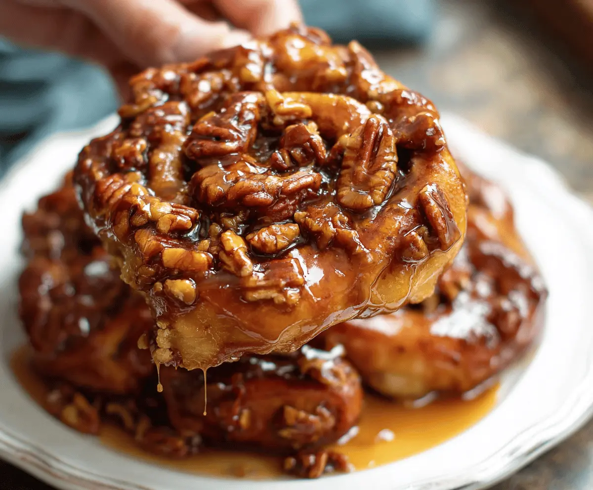 Once they are out of the oven, carefully invert the pan onto a serving platter to let the caramel and pecans drizzle over the buns. Let them sit for a few minutes to set before serving them warm.
