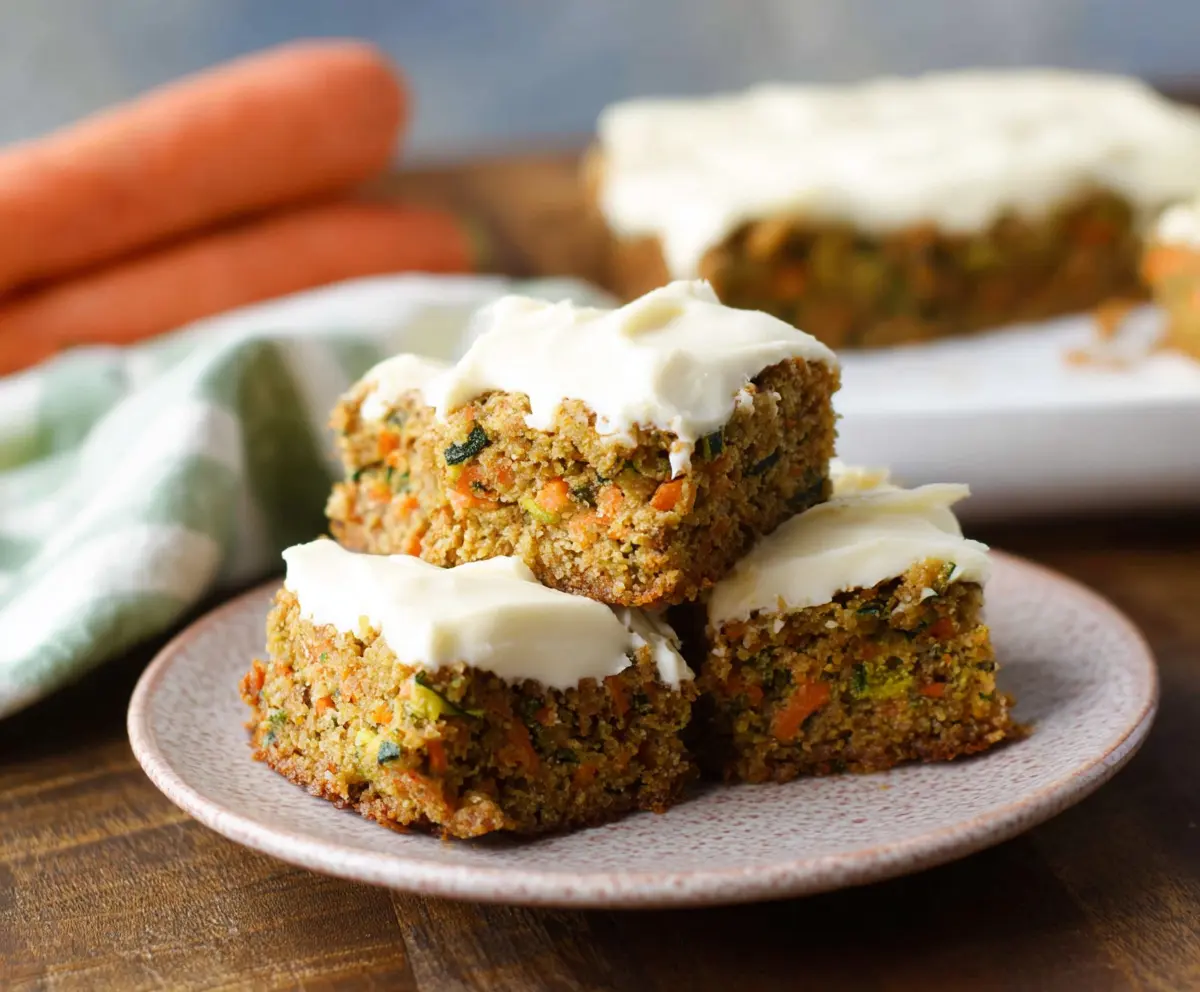 These moist carrot and zucchini bars are bursting with flavor and packed with veggies! Topped with a creamy citrus frosting, they’re the perfect sweet treat for any time of the day.
