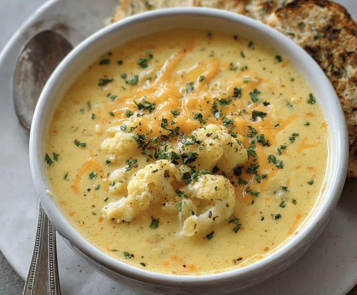 Enjoy this rich, velvety, hearty Cheddar Cauliflower Soup on a chilly day—a perfect blend of cheesy comfort and healthy veggies!