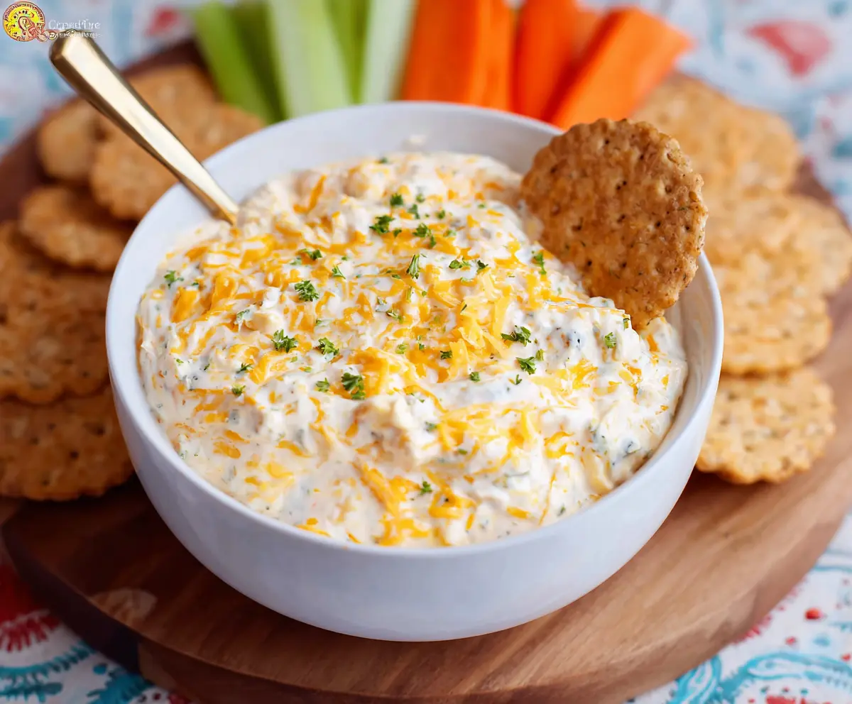 Once chilled, your Cheddar Ranch Dip is ready to serve! Enjoy it with your favorite crackers, chips, or fresh veggies like carrot and celery sticks. It’s sure to be a hit at your gathering!