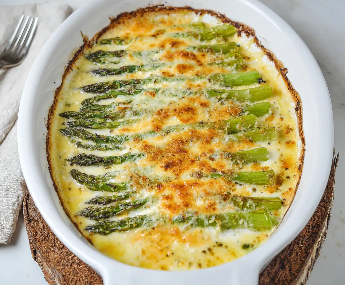 Absolutely! You can prepare the cheesy sauce and blanch the asparagus ahead of time. Just combine everything in the baking dish, cover, and refrigerate. When you’re ready to serve, bake it directly from the fridge, but you may need to add a few extra minutes to the baking time.