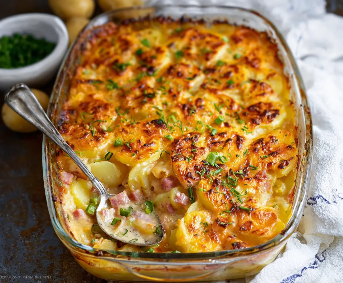 Now it’s time for assembly! In your greased casserole dish, start by layering half of the cooked potatoes. Then, sprinkle half of the diced ham and chopped onions over the potatoes. Pour half of that creamy cheese sauce over this layer. Repeat the process with the remaining potatoes, ham, onions, and cheese sauce.