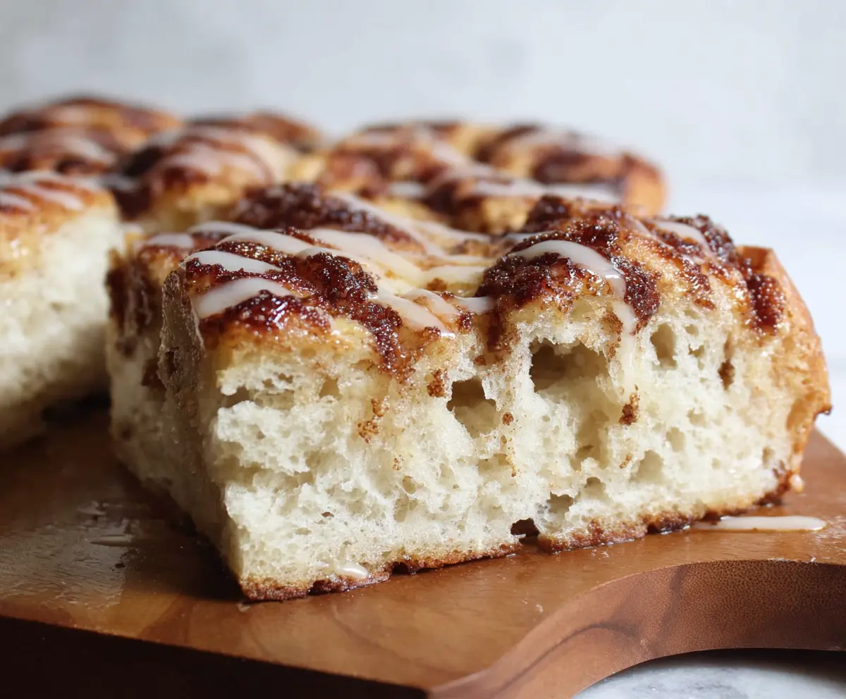 Drizzle the icing generously over the warm focaccia. Serve it warm or let it cool a bit, but enjoy every bite of this delightful mix of sourdough and cinnamon roll flavors!