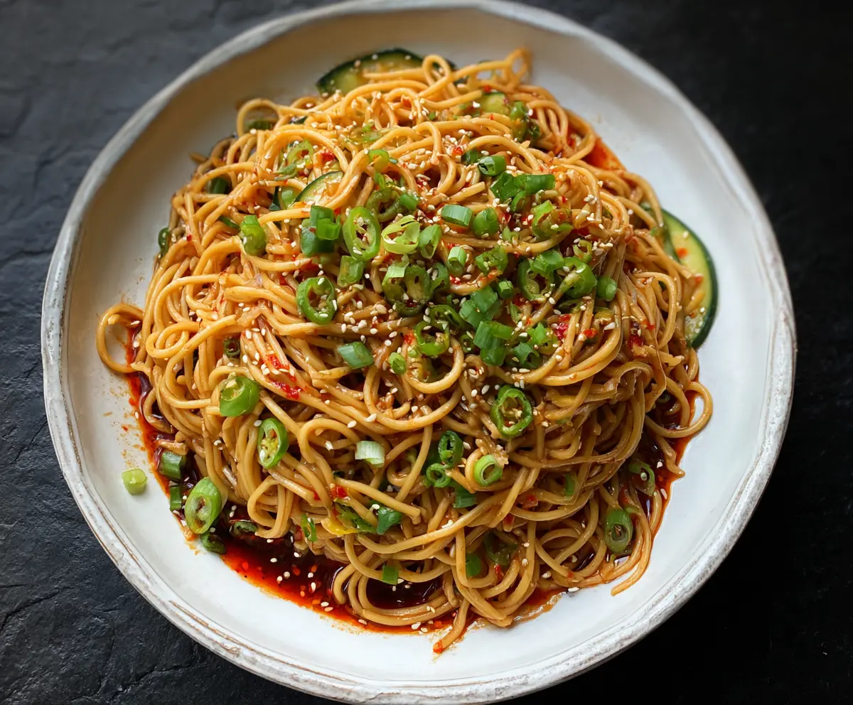 Top the noodles with the sliced green parts of the green onions, toasted sesame seeds, and if you want some extra heat, sprinkle a few chili flakes on top. If you have fresh herbs like cilantro or Thai basil, throw those in too for a pop of freshness!