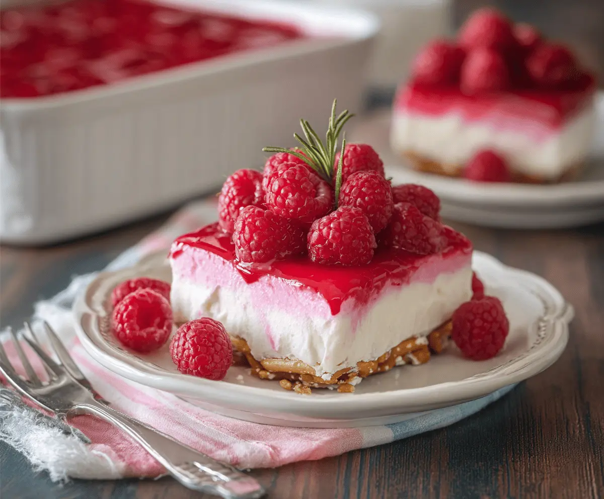 Once it’s chilled and set, cut the dessert into squares. Serve each piece with fresh raspberries on top and a little mini pretzel for that extra special touch! Optionally, drizzle some reserved raspberry sauce around the plate for a pretty presentation.