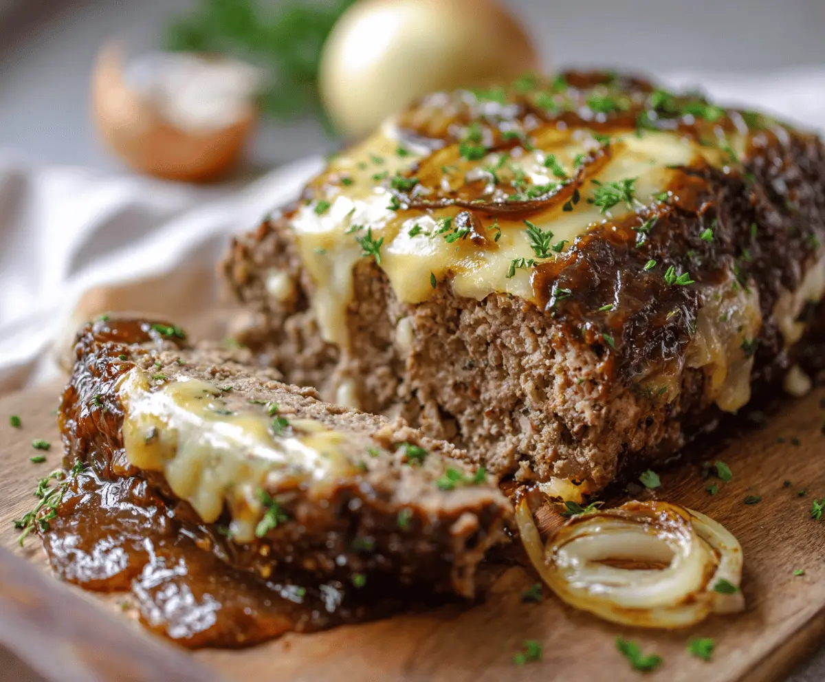 Enjoy this tender, juicy meatloaf, packed with rich French onion flavors and topped with melted Swiss cheese! It’s a comforting meal that’s sure to satisfy!