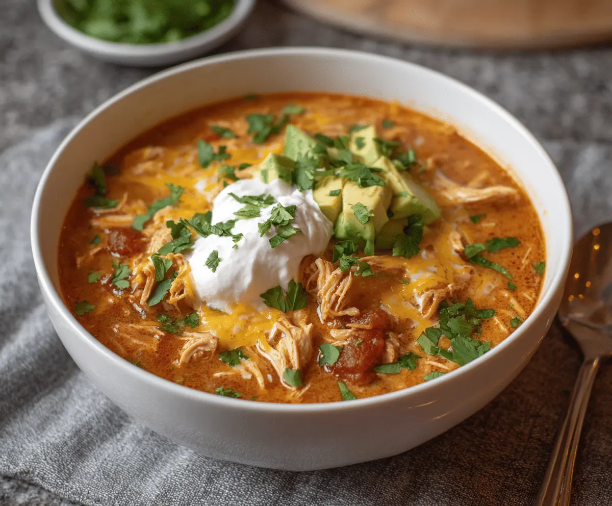 Delicious Crockpot Keto Chicken Taco Soup in a bowl with fresh toppings, ideal for low-carb, high-protein keto diet meals