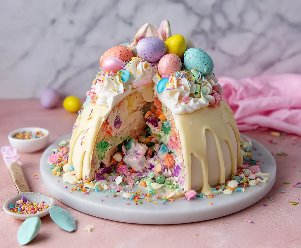 You know you want to smash it open and see all those treats spill out! 🐣 I love making this cake because it’s a hit with kids and adults alike. Great for sharing during Easter festivities!