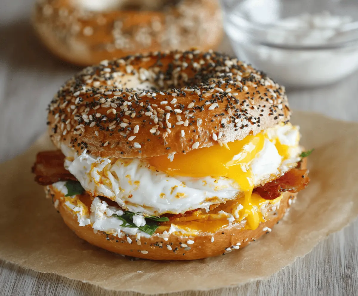To make this sandwich lighter, consider using turkey bacon instead of regular bacon, and opt for a whole grain or seed-based bagel. You can also add fresh veggies like spinach or sliced tomatoes for extra nutrition.