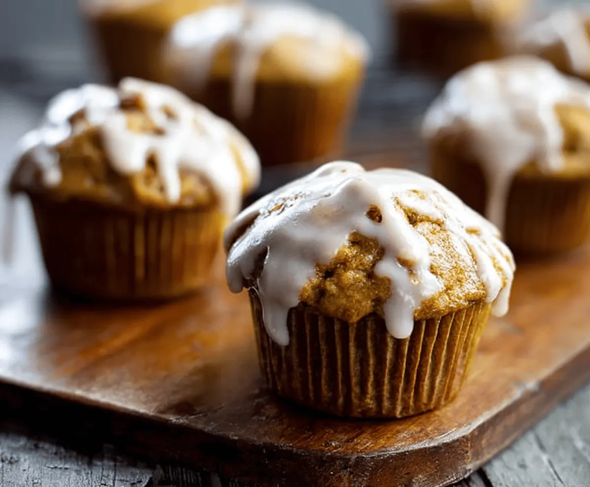 Delicious homemade glazed pumpkin muffins with a golden-brown top and a shiny glaze, perfect for fall breakfast or snacks.