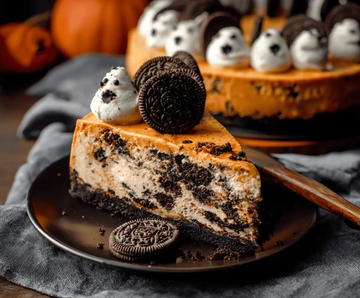 Delicious Halloween Cookies and Cream Cheesecake topped with spooky decorations and cookie crumbles on a festive plate