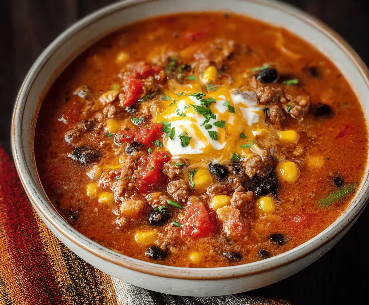 High-protein taco soup in a bowl with ground beef, beans, corn, and fresh toppings ready to serve.