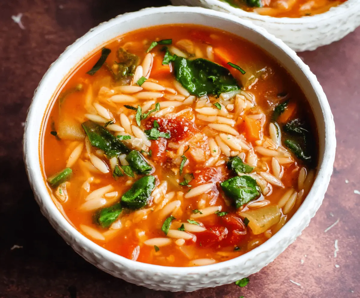 A steaming bowl of Italian Orzo Soup garnished with fresh herbs and grated cheese, showcasing a hearty and comforting Mediterranean-inspired dish.
