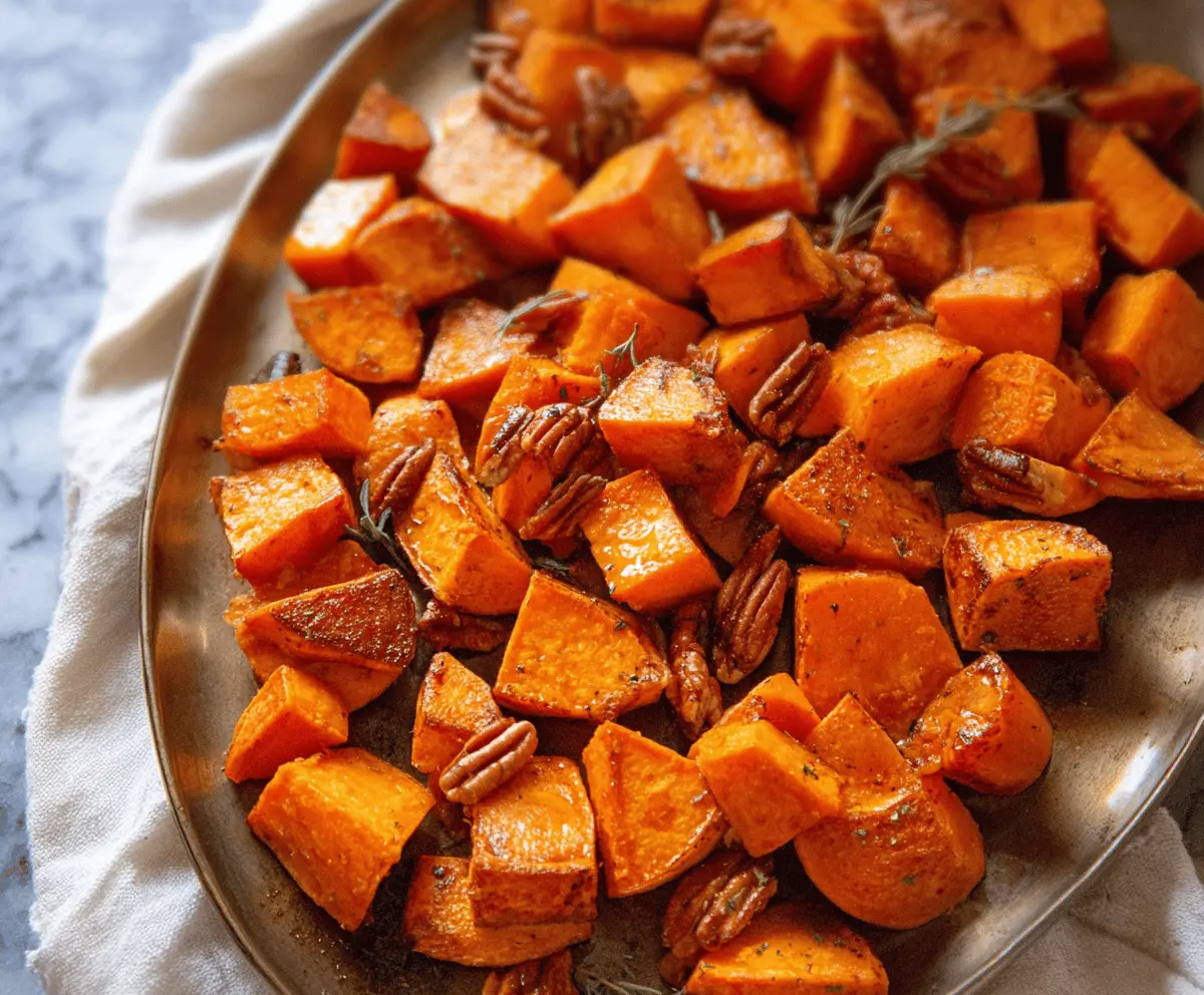 Next, add the pecan halves (if using) and the fresh thyme leaves to the bowl. Gently toss again to distribute the pecans and thyme throughout the sweet potatoes. They’ll add a nice flavor and crunch!