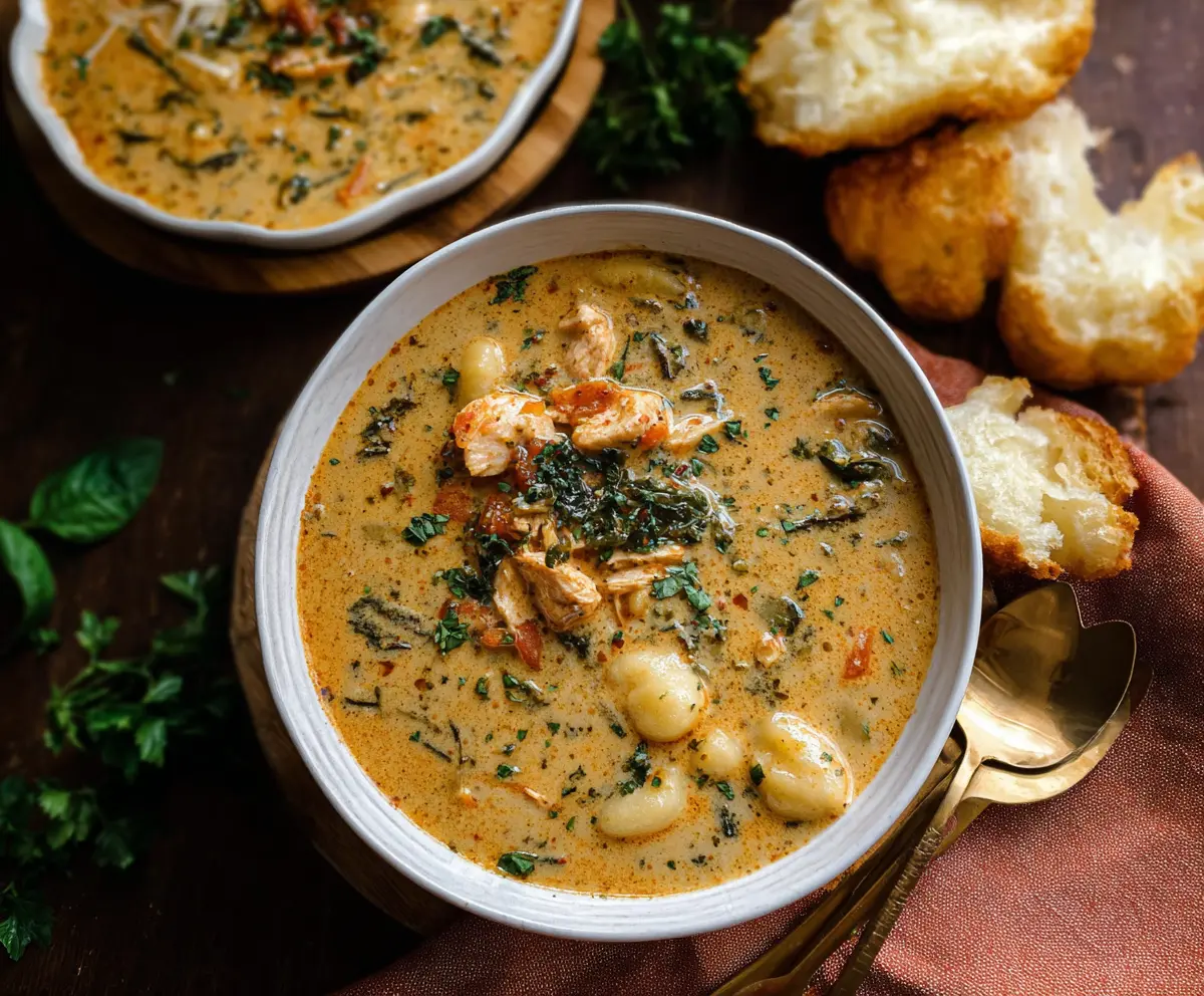 This creamy, flavorful soup features tender chicken, soft gnocchi, vibrant spinach, and sun-dried tomatoes with a herby, slightly spicy broth—perfect for cozy meals.