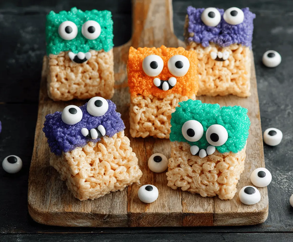These fun Monster Rice Krispie Treats are a playful twist on the classic snack! Made with gooey marshmallows and crispy rice cereal, they’re bursting with colorful sprinkles and candy eyes!