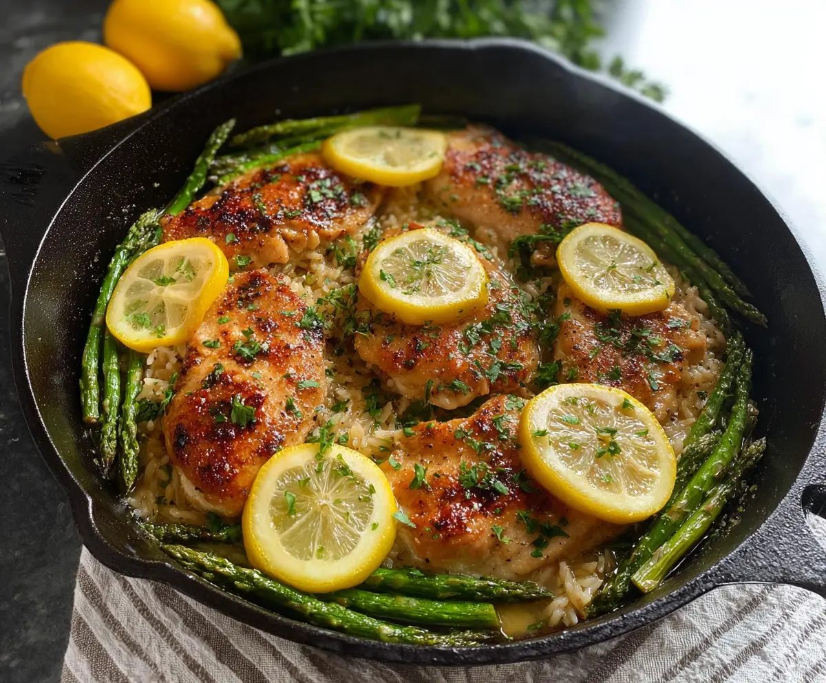 Before serving, sprinkle some chopped fresh parsley on top for a pop of color and flavor. Serve directly from the pan and enjoy the delicious combination of lemon-herb flavors with the tender chicken, fluffy rice, and fresh asparagus!