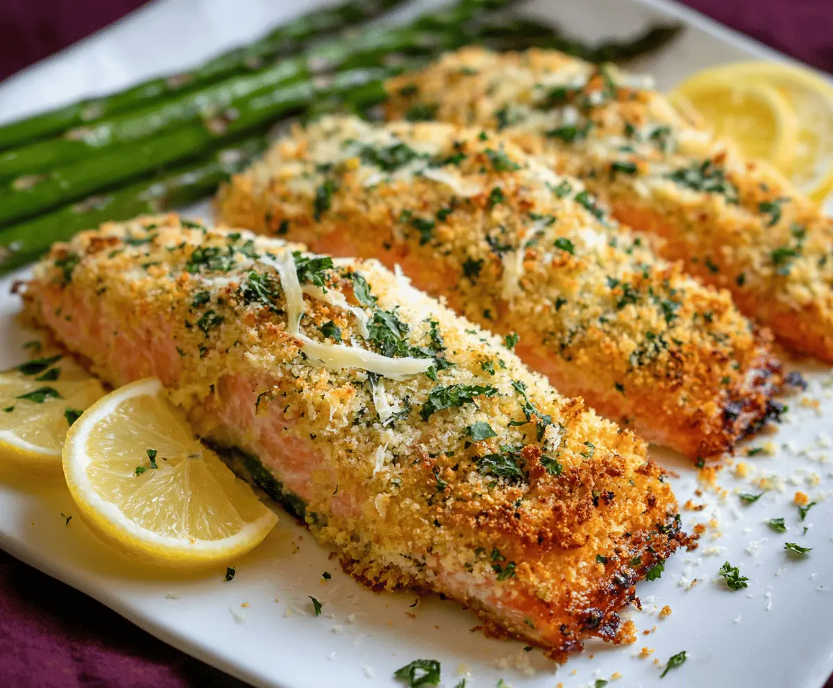 For a complete meal, serve your Parmesan Crusted Salmon with some steamed or roasted asparagus or your favorite green vegetables. Enjoy your delicious and impressive dinner!