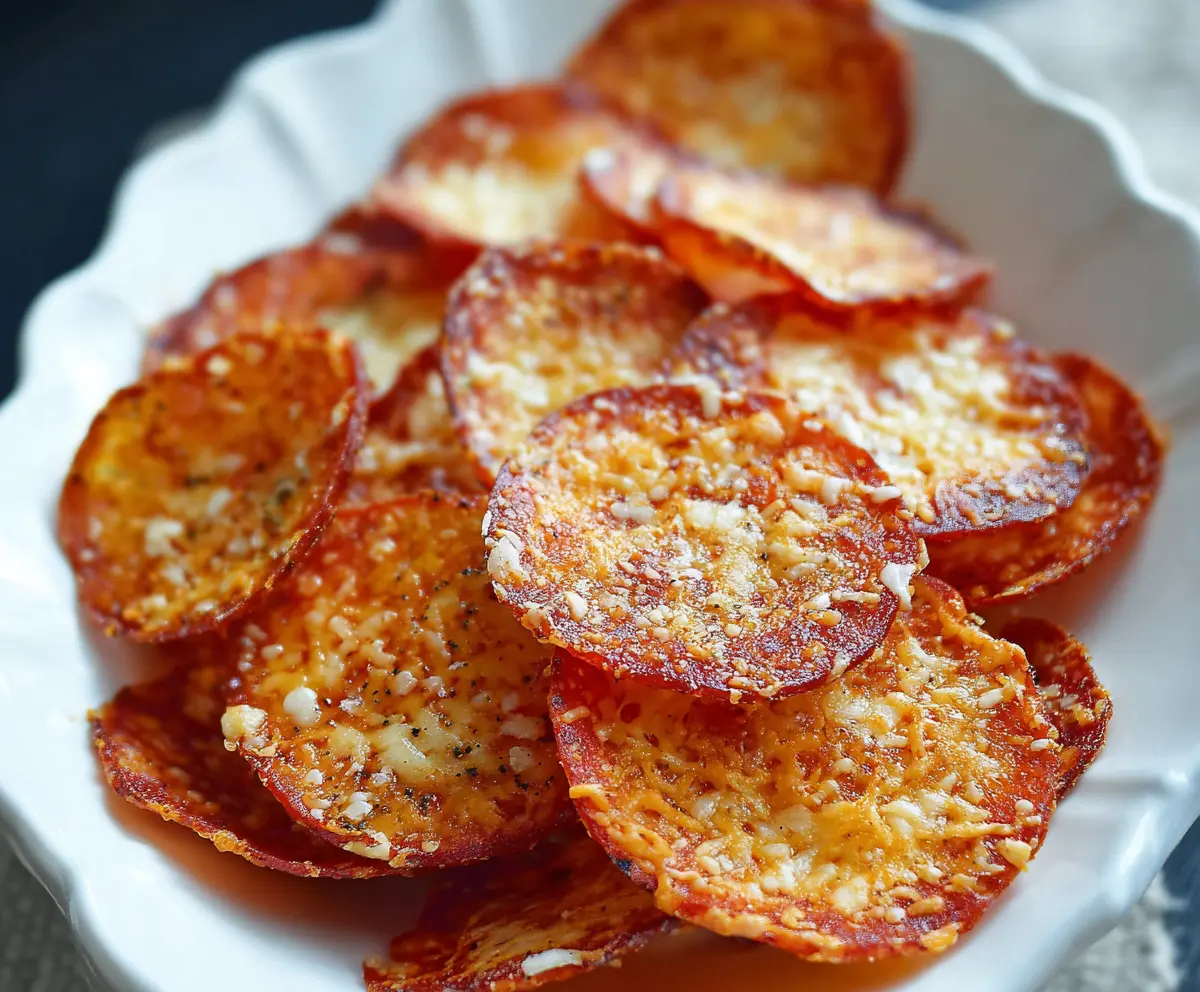 These Pepperoni and Cheese Chips are the perfect crunchy snack! Made with melted cheese and zesty pepperoni, they’re super easy to make and oh-so-tasty.