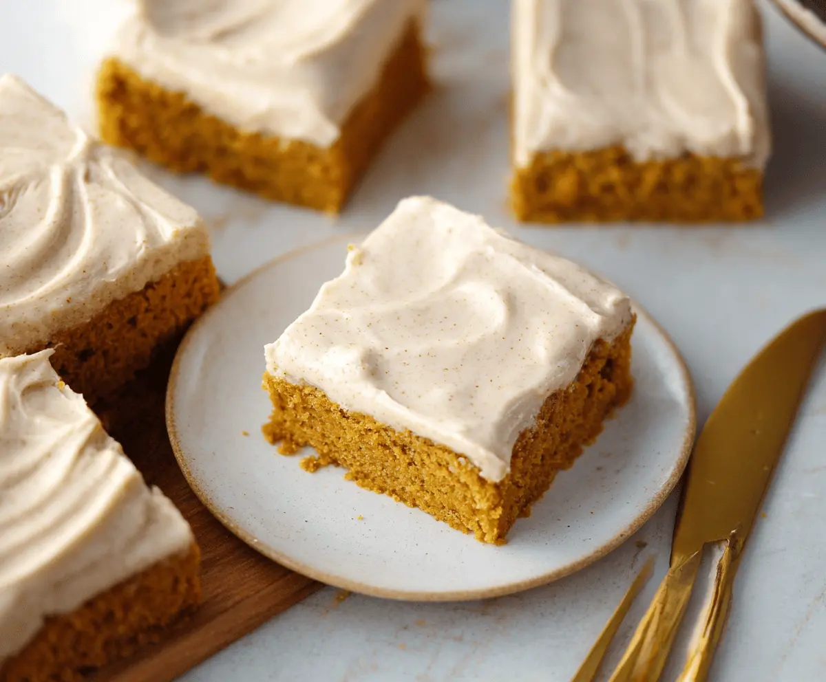 Delicious homemade pumpkin bars topped with creamy brown sugar frosting, perfect for fall desserts and holiday gatherings