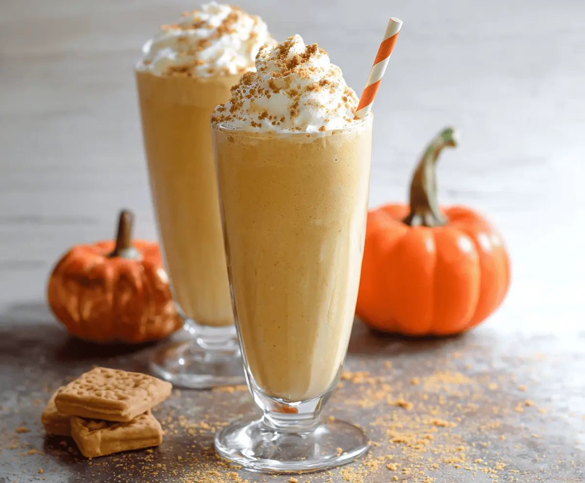 Creamy pumpkin milkshake topped with whipped cream and cinnamon, perfect for fall desserts.