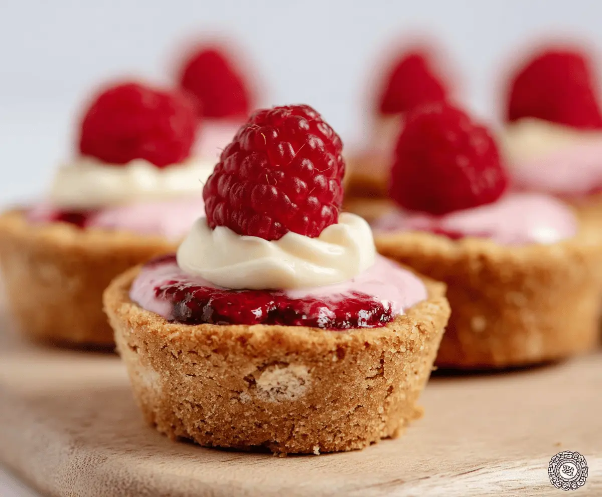 Delicious raspberry cheesecake cookie cups with fresh berries and creamy filling