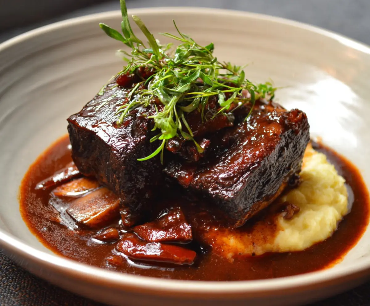 Enjoy the tender, flavorful short ribs alongside creamy mashed potatoes for a perfect hearty meal!
