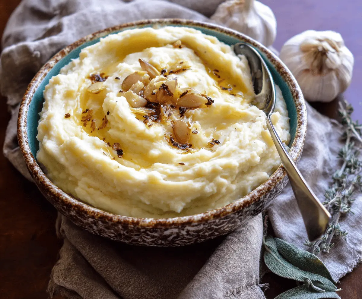 Creamy roasted garlic mashed potatoes served in a rustic bowl, perfect for a comfort food dinner.