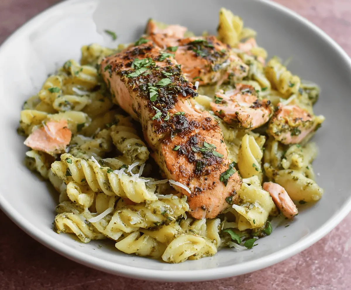 Dig in and savor this delicious Salmon Pesto Pasta!