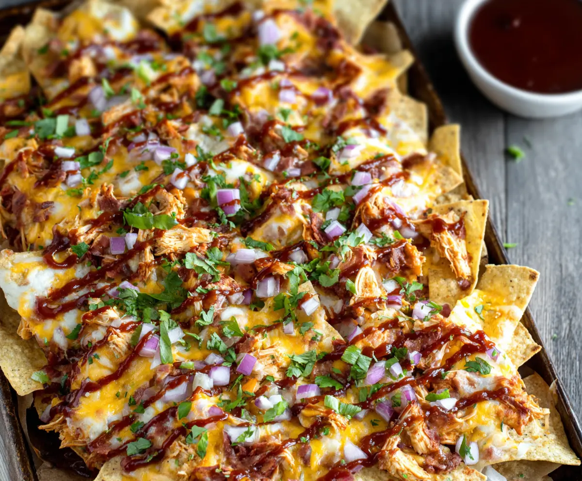 Serve immediately while everything is warm and cheesy. Grab some plates and enjoy your fantastic BBQ Chicken Nachos with friends and family!