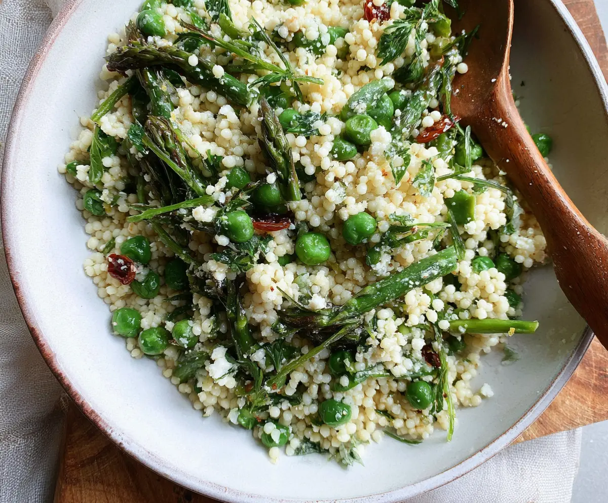 This dish takes about 30 minutes to prepare. You’ll need around 10 minutes to cook the couscous and veggies, and then about 20 minutes for mixing everything together and letting the flavors meld. It’s a quick and colorful salad that’s perfect for spring!