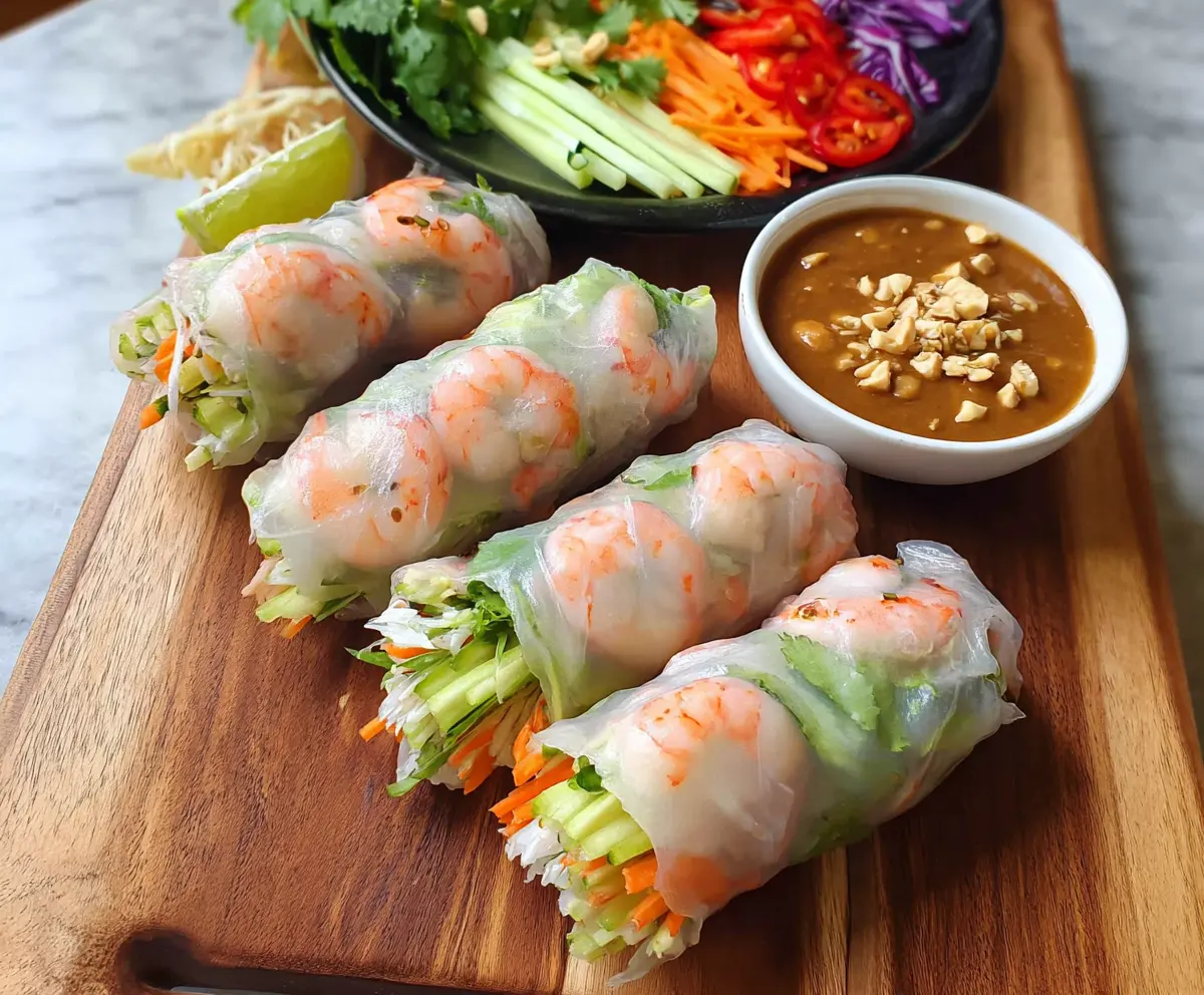 These fresh spring rolls are filled with crunchy veggies and herbs, wrapped tightly in rice paper for a perfect bite. The creamy peanut sauce makes them taste even better!