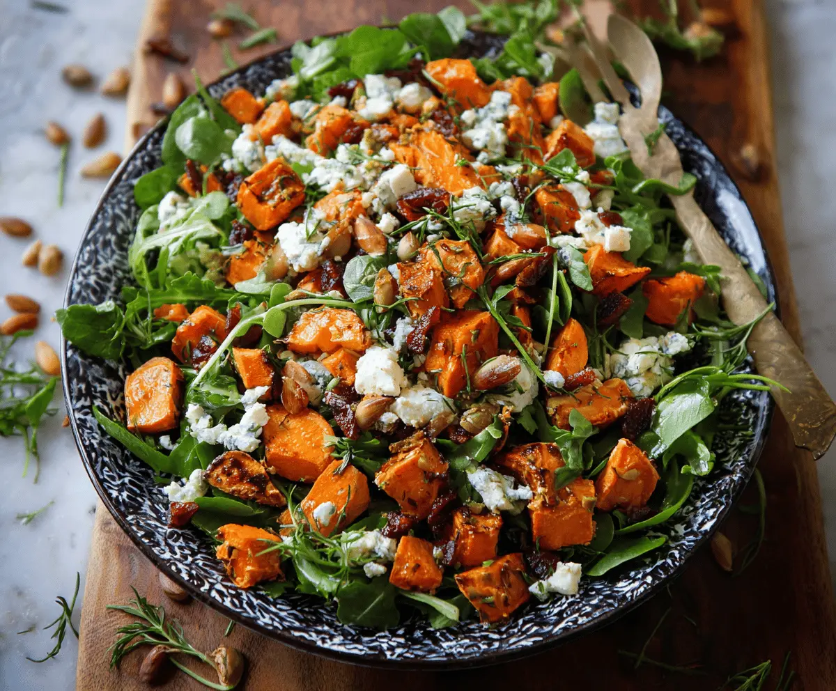 Sprinkle the crumbled feta cheese evenly over the roasted sweet potatoes. Then add the pumpkin seeds for a delightful crunch. If you’re using dried cranberries or raisins, toss those in for a sweet pop of flavor!