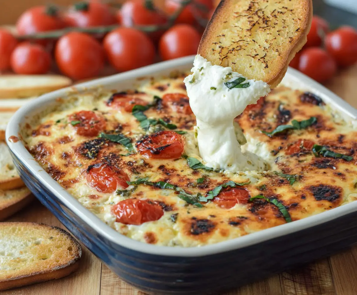 Yes! You can prepare the dip ahead of time by mixing the ingredients and storing them in the baking dish without the tomatoes on top. Just cover it with plastic wrap and refrigerate. When you’re ready to bake, add the tomatoes and basil, drizzle with olive oil, and bake as directed.