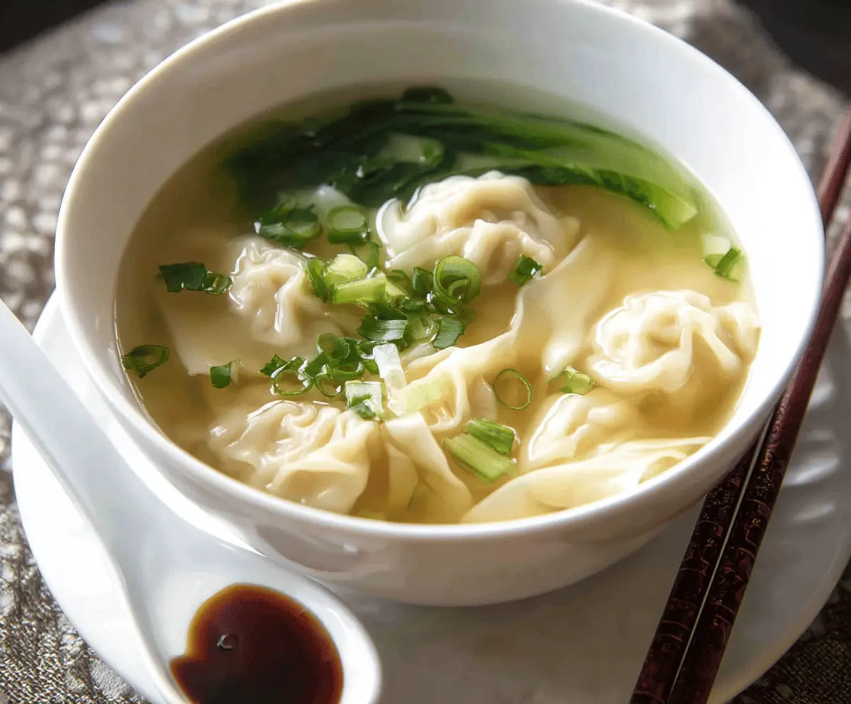 A steaming bowl of wonton soup garnished with chopped green onions and fresh herbs, showcasing tender wontons floating in flavorful broth.